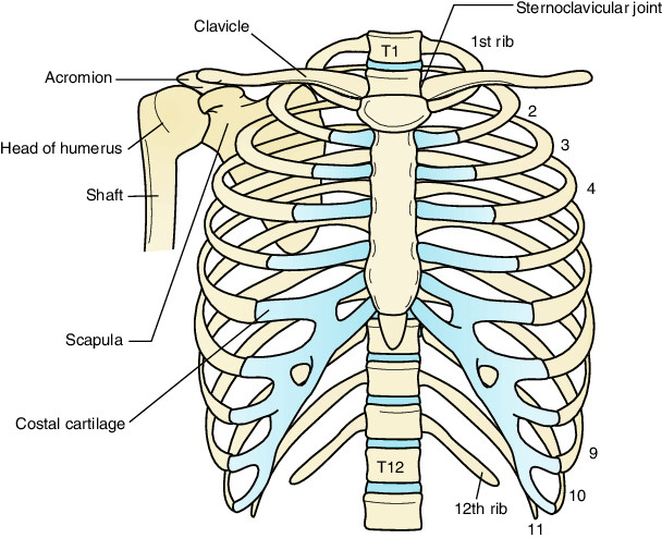 The part of the ventral cavity above the diaphragm, the domed muscle that separates it from the abdominal cavity; it is enclosed by the chest wall. The thoracic viscera include the pleural membranes that surround the lungs, the mediastinum between the lungs, which contains the heart and pericardial membranes, the thoracic aorta, pulmonary artery and veins, vena cavae, thymus gland, lymph nodes, trachea, bronchi, esophagus, and thoracic duct.