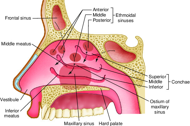 One of two cavities between the floor of the cranium and the roof of the mouth, opening to the nose anteriorly and the nasopharynx posteriorly. Its lining of ciliated epithelium warms and moistens inhaled air, and traps dust and pathogens on mucus that are then swept toward the pharynx. The nasal septum separates the nasal cavities. The olfactory receptors are in the upper part of each cavity. The paranasal sinuses open into the meatus below the conchae. The orifices of the frontal, anterior ethmoidal, and maxillary sinuses are in the middle meatus. The orifices of the posterior ethmoidal and sphenoidal sinuses are in the superior meatus. The nasal mucosa is highly vascular; blood is supplied by the maxillary arteries from the external carotid arteries and by the ethmoidal arteries from the internal carotid arteries.